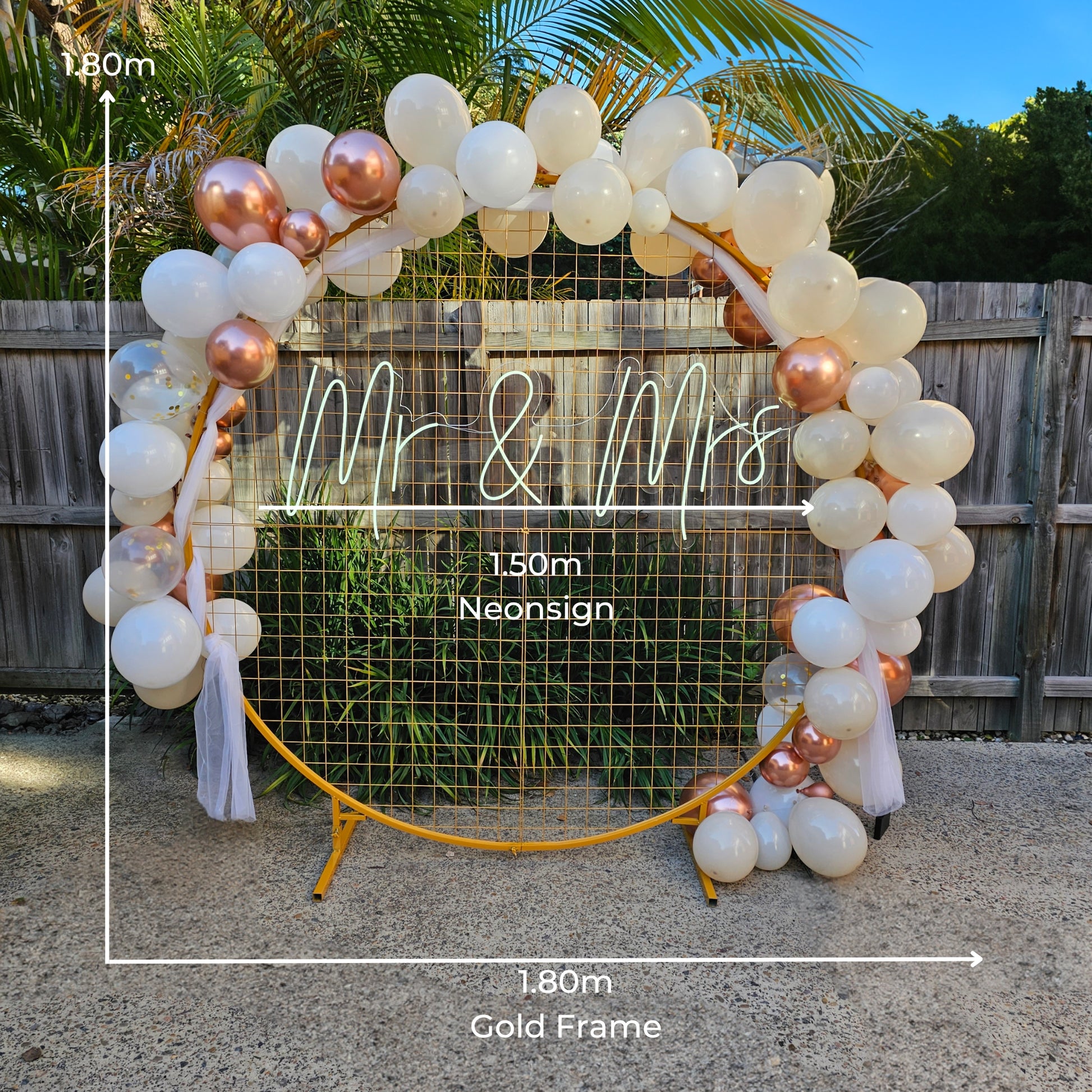 Introducing our stunning wedding backdrop, featuring a gorgeous 1.8 meter gold circle with a beautiful 1.50 meter neonsign of Mr & Mrs. This elegant and modern design is sure to add a touch of glamour to your special day and create a perfect backdrop for those memorable photos.